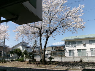 給食室からみえる桜がとても綺麗です。今日はみんな大好きなチキンライスです。